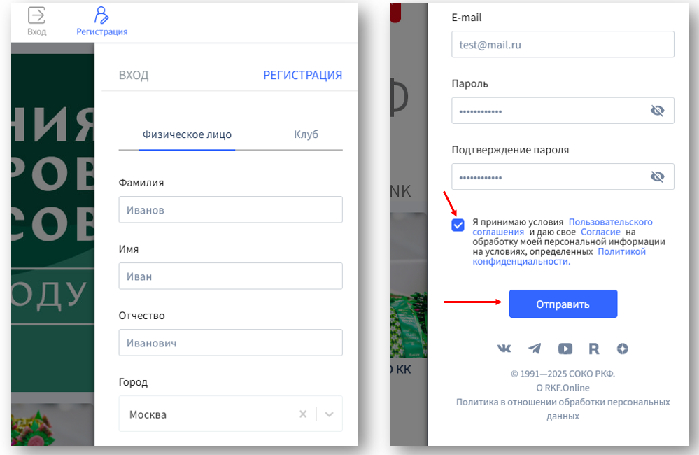После заполнения указанных полей ознакомьтесь с условиями Пользовательского соглашения, Согласия на обработку персональных данных, Политикой конфиденциальности и нажмите кнопку "Отправить".