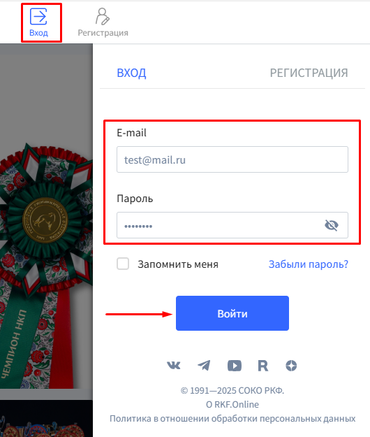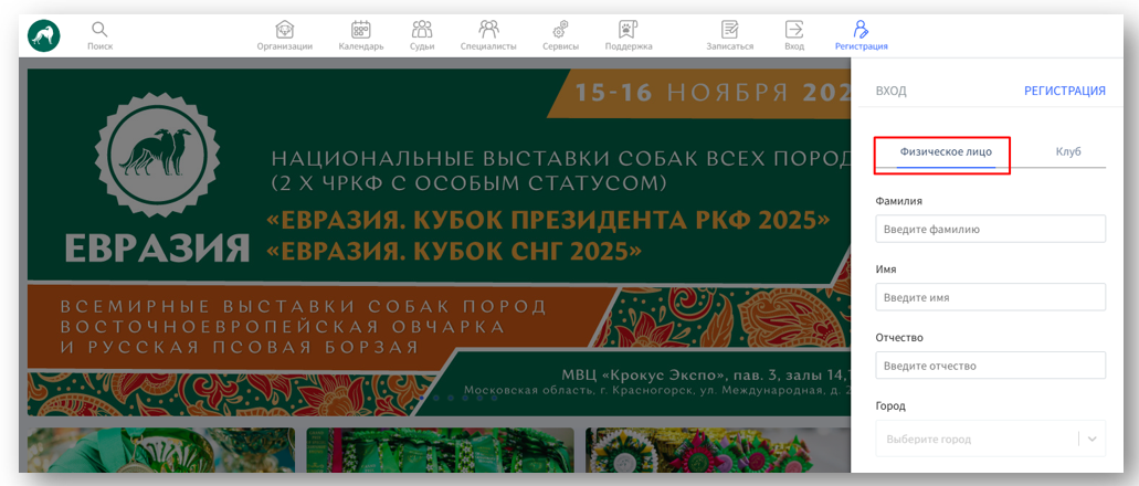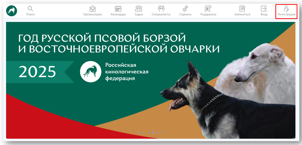 Чтобы зарегистрироваться на платформе RKF.Online как физическое лицо, нажмите кнопку "Регистрация" в правой верхней панели меню: