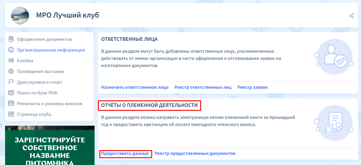 Далее в открывшимся окне в блоке ОТЧЁТЫ О ПЛЕМЕННОЙ ДЕЯТЕЛЬНОСТИ нужно выбрать пункт "Предоставить данные".