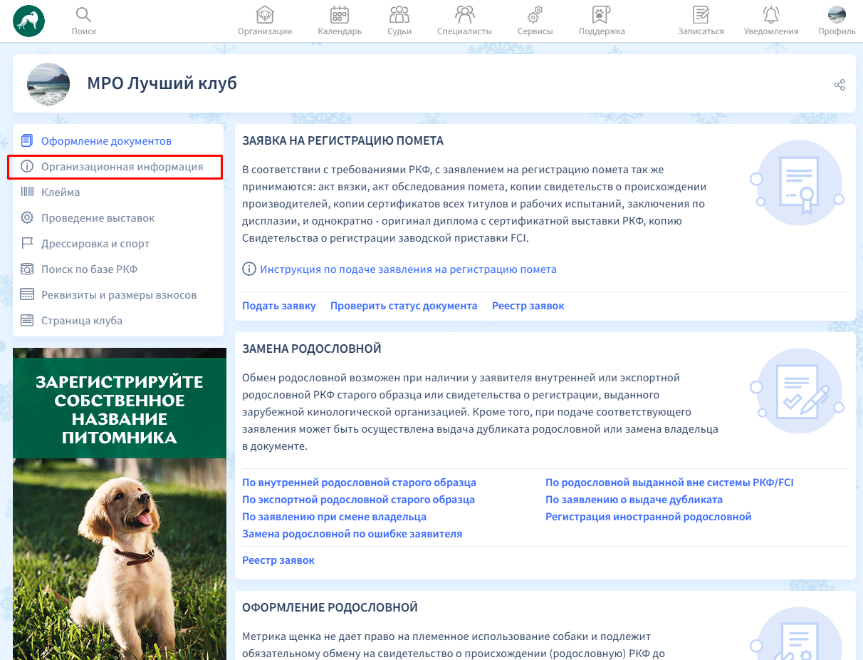 В личном кабинете в левой части страницы есть меню для перехода в другие разделы. Вам необходимо выбрать раздел "Организационная информация".