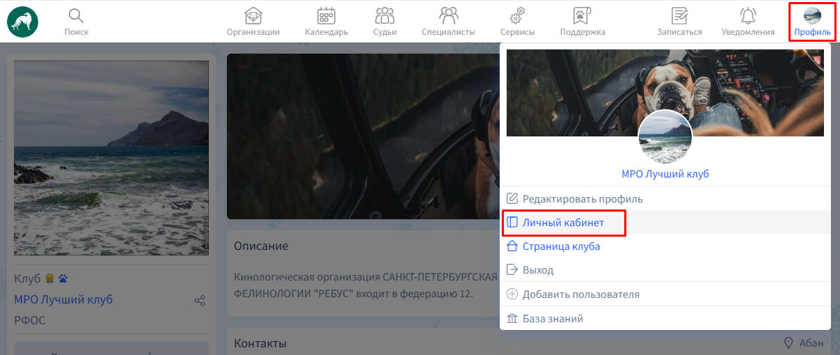 Далее необходимо войти в Профиль -> Личный кабинет.