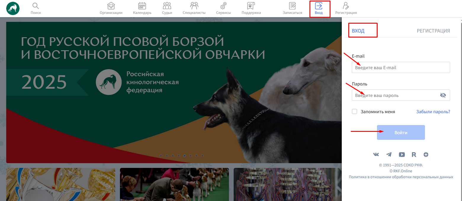 Чтобы подать отчёт о племенной деятельности, необходимо войти в аккаунт на платформе RKF.Online через раздел "Вход" на главной странице сайта https://rkf.online/.