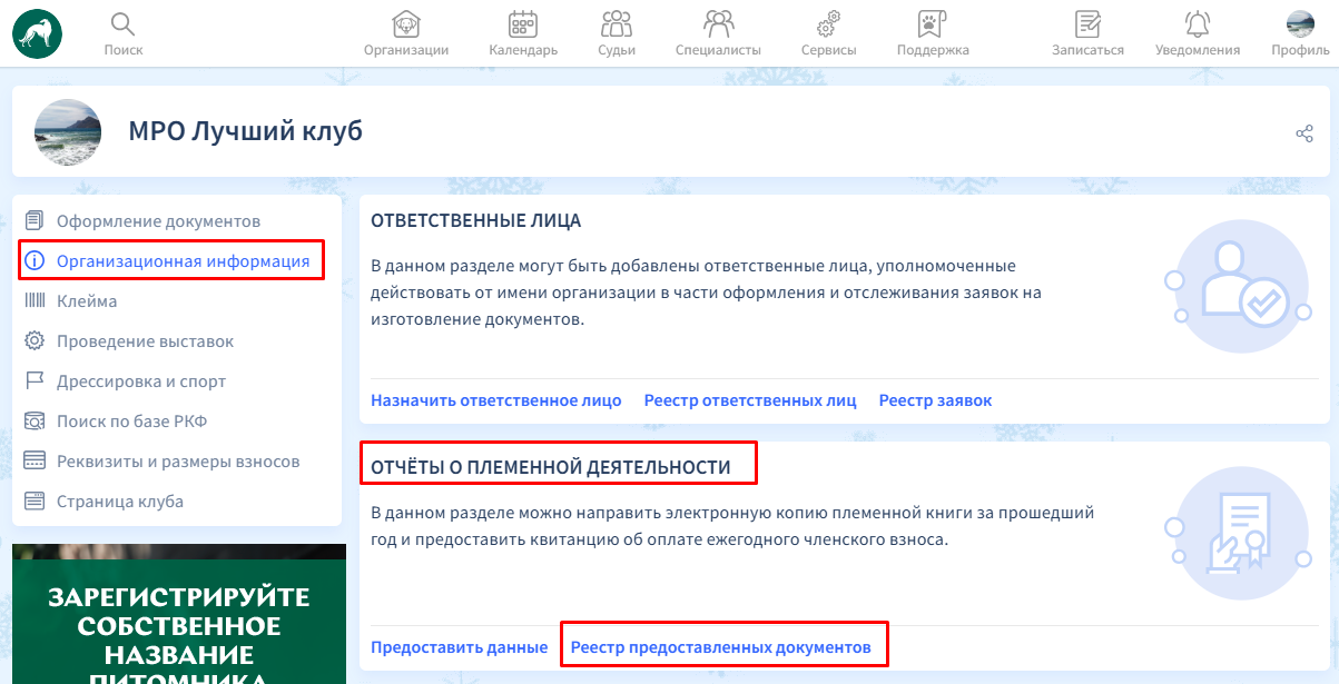 Отправленная заявка сразу будет отображена в реестре заявок, и ей будет присвоен трек-номер. Чтобы посмотреть трек-номер отправленной заявки, вернитесь на страницу "Организационная информация". В блоке ОТЧЁТЫ О ПЛЕМЕННОЙ ДЕЯТЕЛЬНОСТИ выберите "Реестр предоставленных документов".