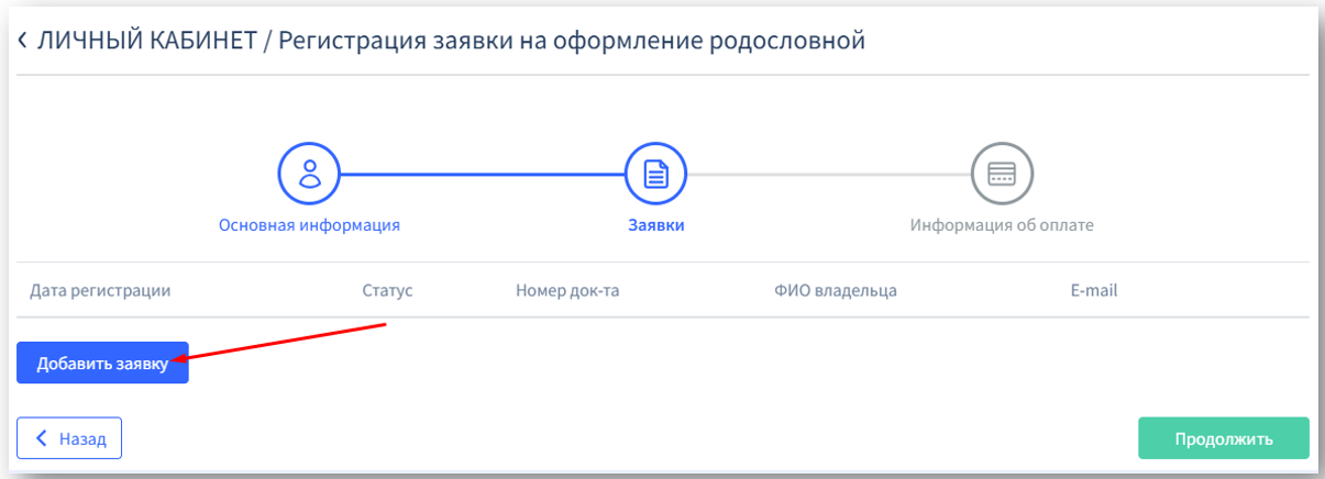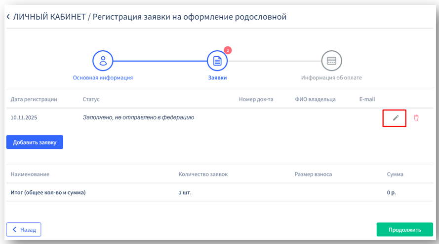 4. Далее откроется страница со вторым этапом "Заявки", в котором можно отредактировать заявку, нажав на значок "карандаша". Есть возможность изменить поля, прикрепить другие документы, выбрать другие значения в выпадающих списках.