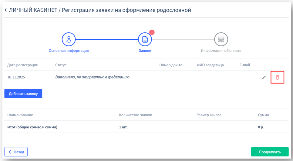 Для редактирования или удаления данных уже созданной заявки необходимо: