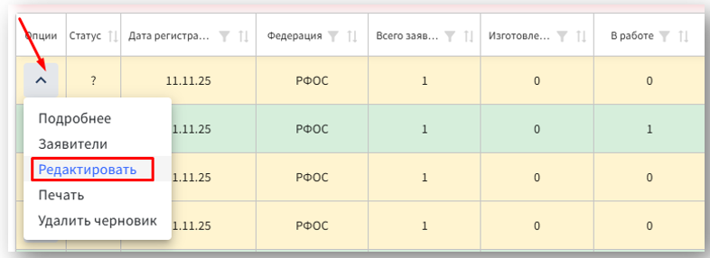 2. На открывшейся странице отобразится таблица со всеми заявками. Заявка в статусе черновика имеет желтый цвет и обозначается знаком «?». Для перехода в неё необходимо нажать галочку в столбце "Опции" -> «Редактировать».