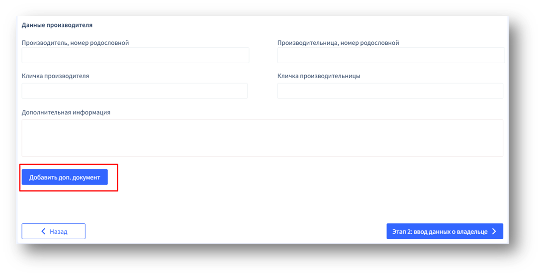 1) на этапе "Данные собаки" после заполнения информации о собаке внизу страницы заявки нажмите кнопку "Добавить доп. документ",