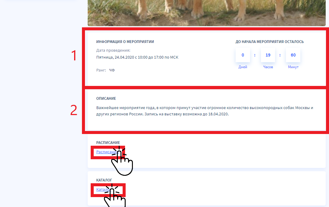 После нажатия откроется страница выставки. Данная страница начинается с блока с названием клуба-организатора в верхней части. Далее представлены следующие элементы: