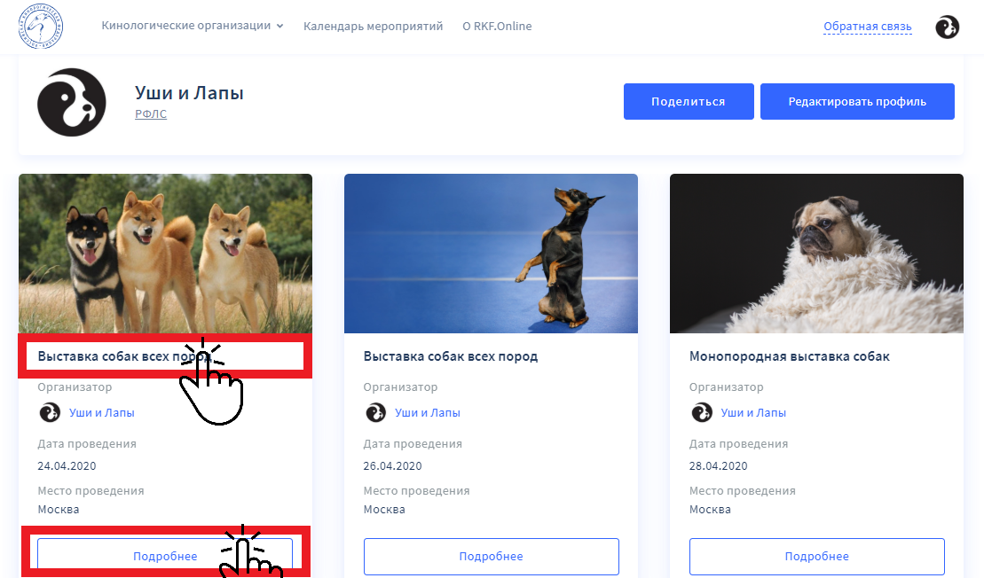 Перейти к определенной выставке возможно из нескольких разделов платформы RKF.Online: на главной странице, на странице календаря мероприятий и на публичной странице клуба. Для перехода к одной из выставок нажмите на название или кнопку «Подробнее».