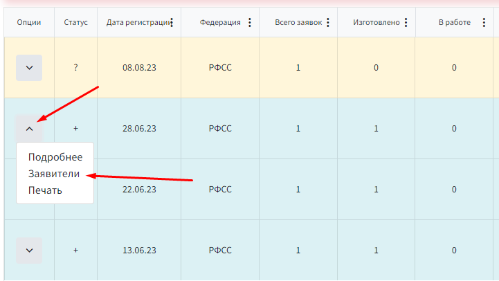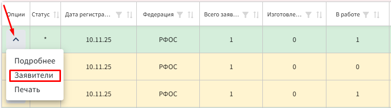 В левой части таблицы в столбце "Опции" необходимо нажать на галочку (V) и выбрать "Заявители".