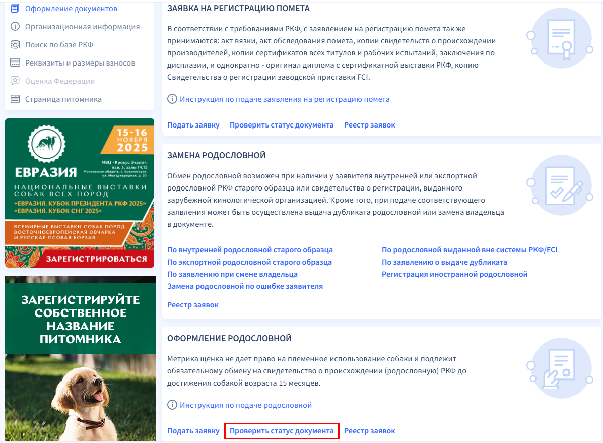 В Личном кабинете зайдите в блок ОФОРМЛЕНИЕ РОДОСЛОВНОЙ -> Проверить статус документа.