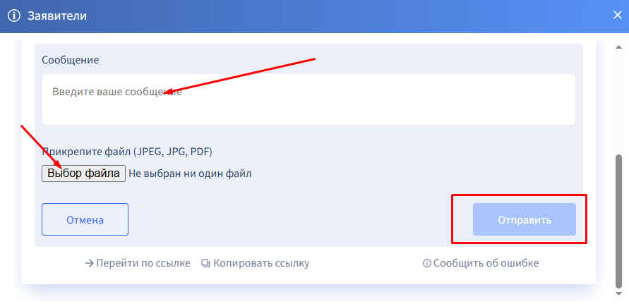 В открывшемся окне укажите информацию об ошибке и вложите документы → нажмите "Отправить"