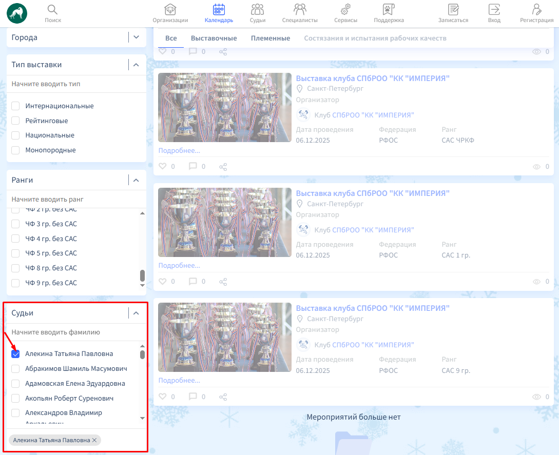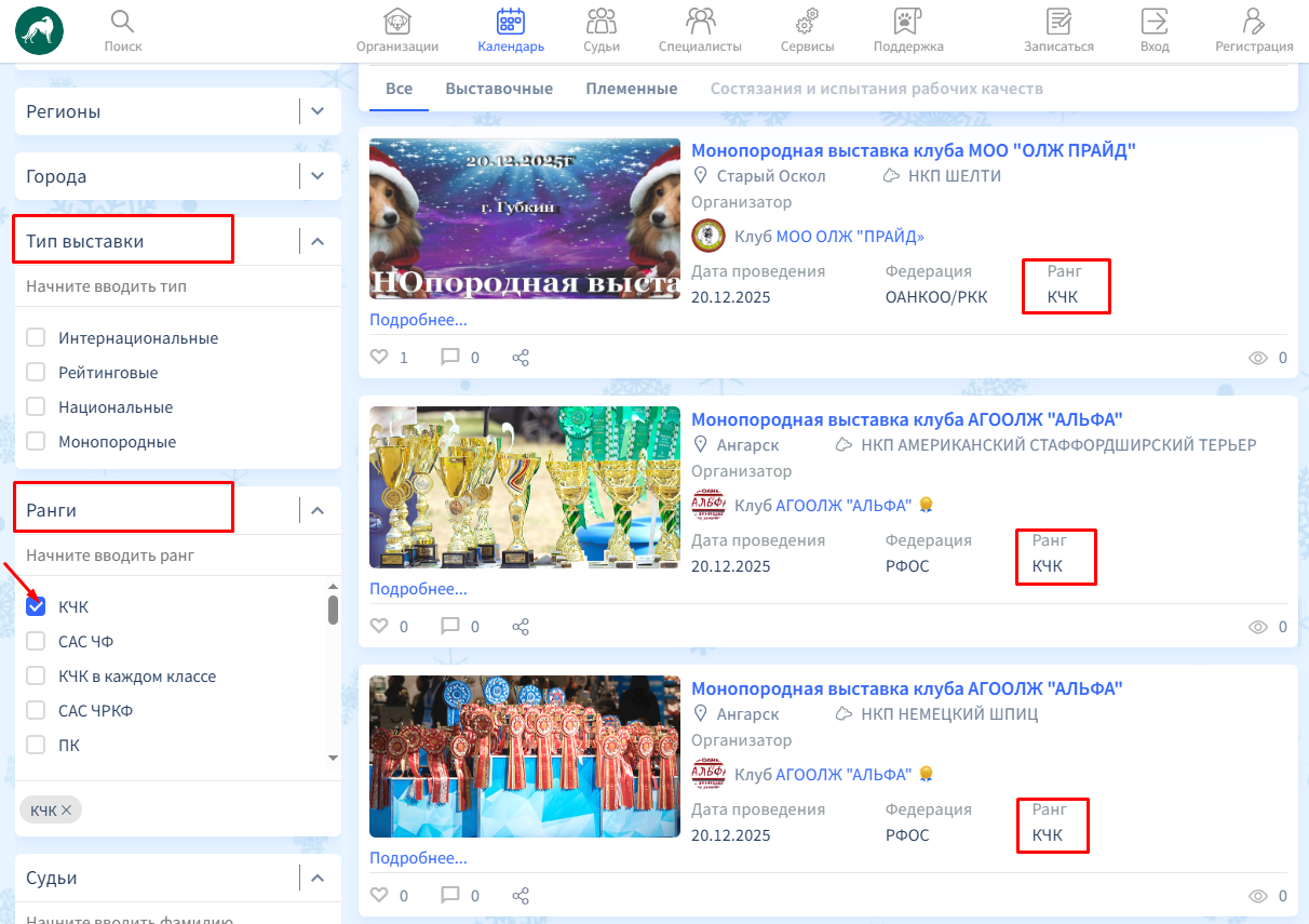 Также, кроме временных фильтров, присутствуют фильтры по породе, регионам, городу, типу выставки, рангу и судьям.
