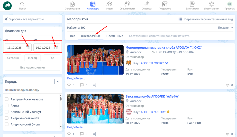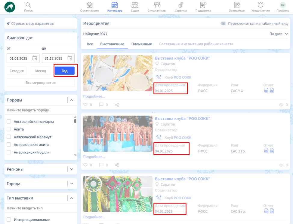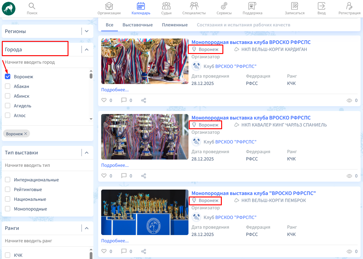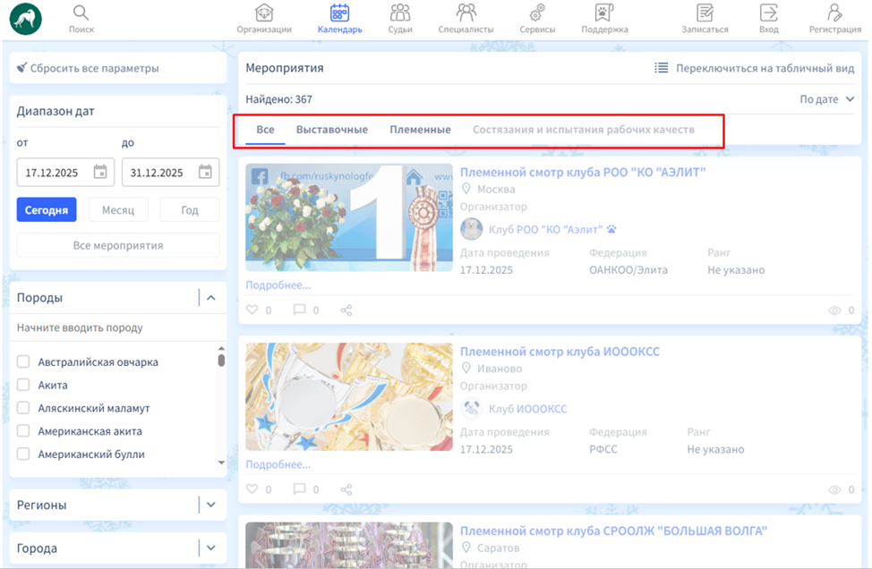 В данном разделе платформы представлены выставочные, племенные мероприятия, а также состязания и испытания рабочих качеств, организуемые кинологическими клубами и другими организациями в системе РКФ. Чтобы открыть список конкретного вида мероприятий, вы можете нажать на соответствующую кнопку в начале списка. Или оставьте активной кнопку «Все», в таком случае перед вами будут представлены сразу все виды мероприятий.