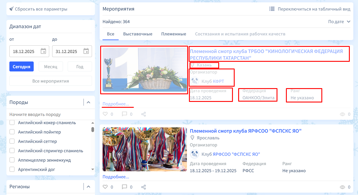 В карточке мероприятия содержатся: изображение, название мероприятия, город проведения, название клуба-организатора, дата проведения, федерация, ранг. Некоторые детали являются активными ссылками. Например, при нажатии на изображение, название мероприятия или кнопку «Подробнее» вы перейдете на страницу данного мероприятия, где будет представлена более подробная информация. Также можно нажать на название организатора — в этом случае вы попадете на публичную страницу клуба или другой кинологической организации.