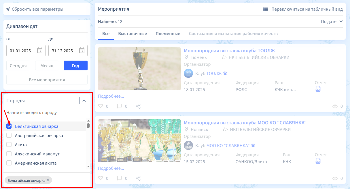 Для просмотра мероприятий по определенной породе нажмите на пустой квадрат рядом с названием породы, чтобы отметить его галочкой. Для быстрого поиска по списку вы можете начать вводить текстом название породы в соответствующем поле, тогда система отобразит все совпадения из списка пород, а вы сможете поставить галочки на нескольких породах при необходимости.