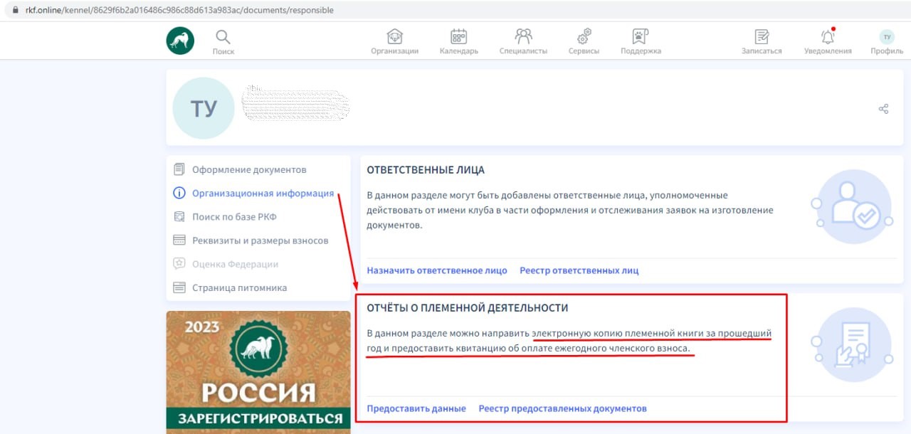 Членство в Федерации подтверждается в личном кабинете кинологической организации, питомника на платформе RKF.Online в разделе «ОРГАНИЗАЦИОННАЯ ИНФОРМАЦИЯ» – «ОТЧЁТЫ О ПЛЕМЕННОЙ ДЕЯТЕЛЬНОСТИ» – «Предоставить данные».