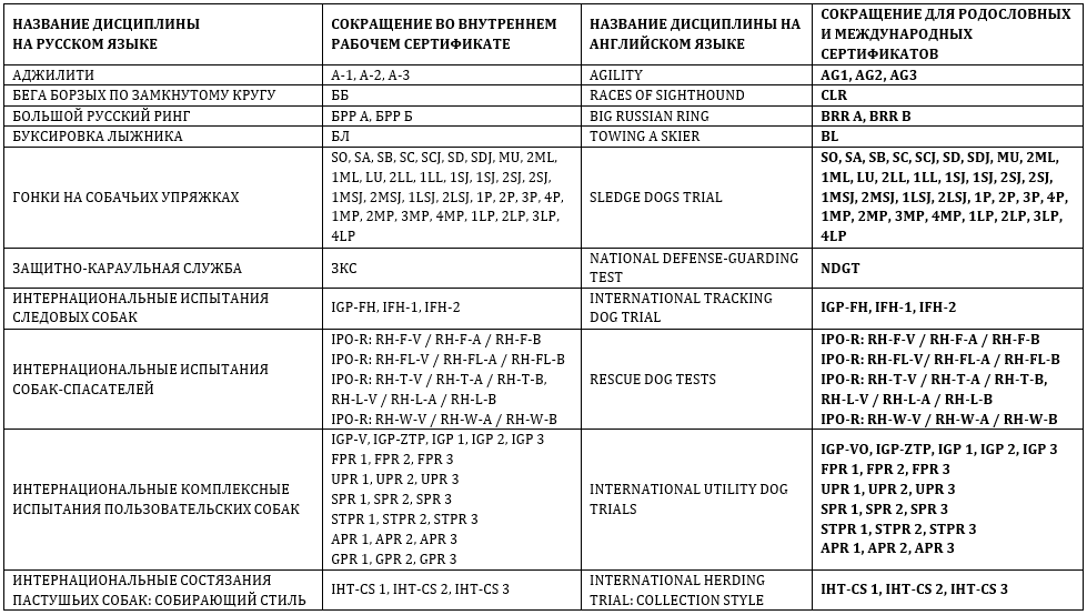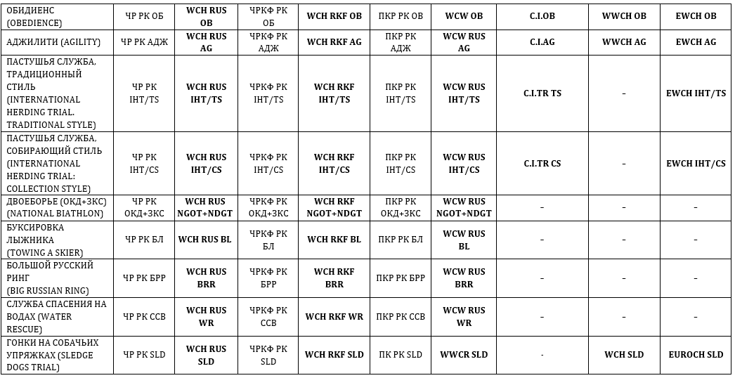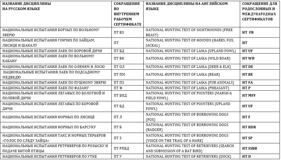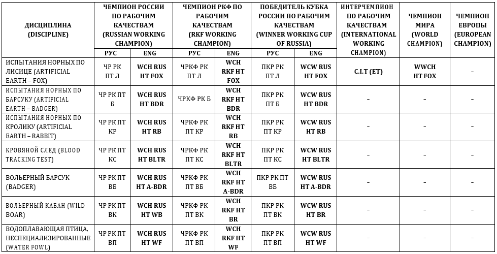 СОКРАЩЕНИЯ НАЗВАНИЙ РАБОЧИХ ТИТУЛОВ ДЛЯ ОХОТНИЧЬИХ ДИСЦИПЛИН