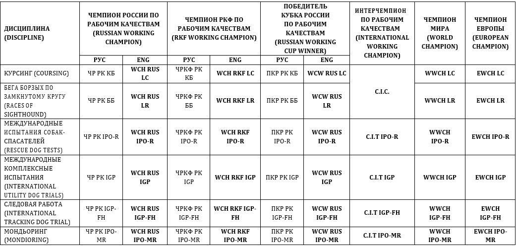 • National Breed Club Working Champion (Чемпион НКП по рабочим качествам) – WCH CLUB [+ перечень стран в сокращениях согласно стандарту ISO-3, сначала Россия, далее остальные страны в алфавитном порядке]