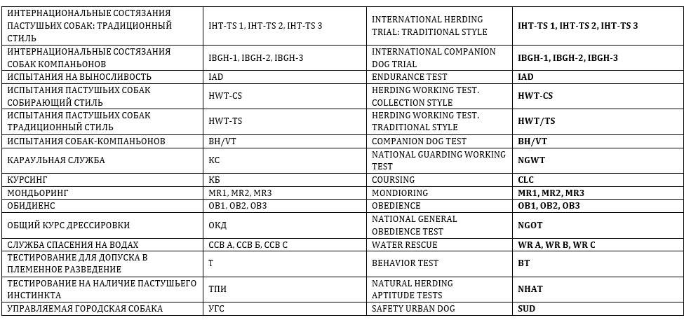 ПРИНЯТЫЕ СОКРАЩЕНИЯ НАЗВАНИЙ ИСПЫТАНИЙ И СОСТЯЗАНИЙ ПО ВСЕМ ВИДАМ ОХОТНИЧЬИХ ДИСЦИПЛИН