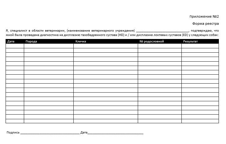 – заполненный бланк договора-заявки, подписанный владельцем собаки, специалистом, который проводил рентгенологическое исследование, и специалистом в области ветеринарии, который проводил оценку;