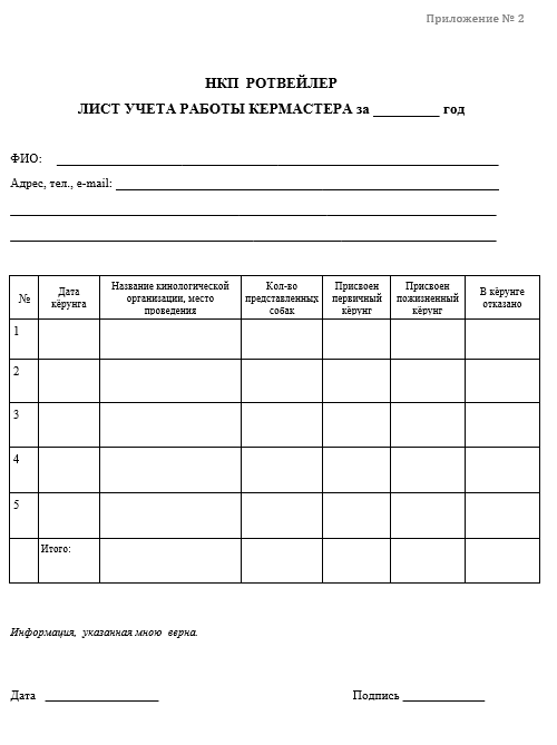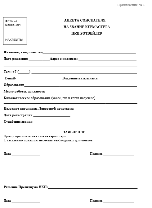 1.2 . Ежегодно НКП Ротвейлер подает в Квалификационную комиссию судей РКФ по экстерьеру список кермастеров НКП. Список кёрмастеров утверждается Квалификационной комиссией судей РКФ по экстерьеру с последующим утверждением Президи-умом РКФ.