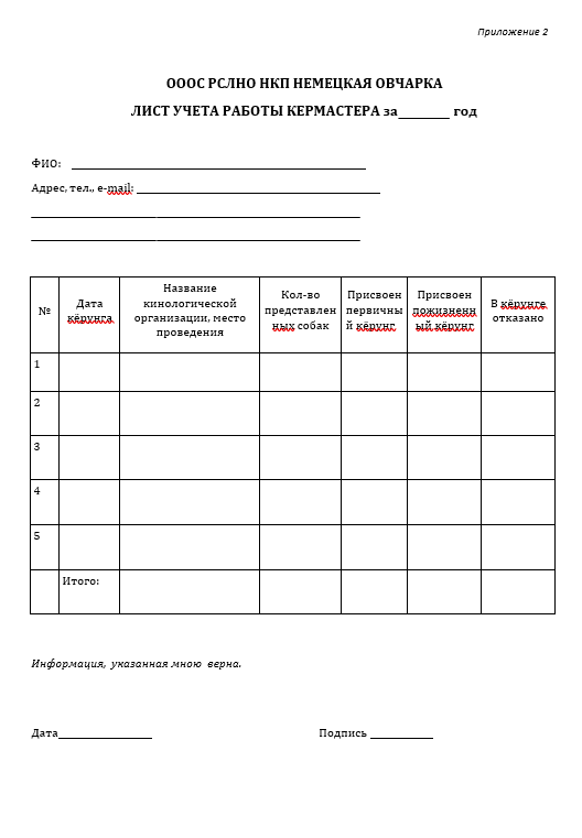 Приложение 2 к Положению НКП-РКФ о кермастерах по породе немецкая овчарка