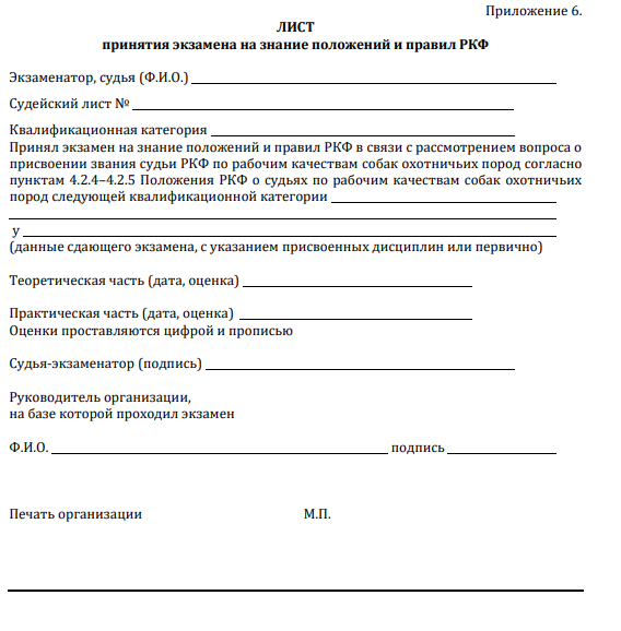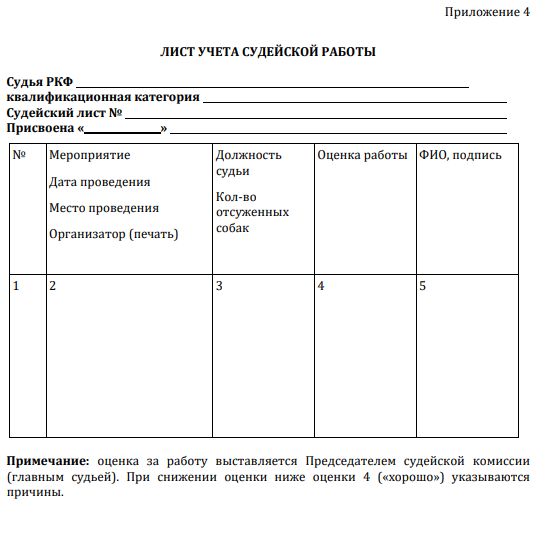 7.3.5. Лист учёта судейской работы (Приложение 4) или копия квалификационной книжки судьи, утвержденной в РКФ.