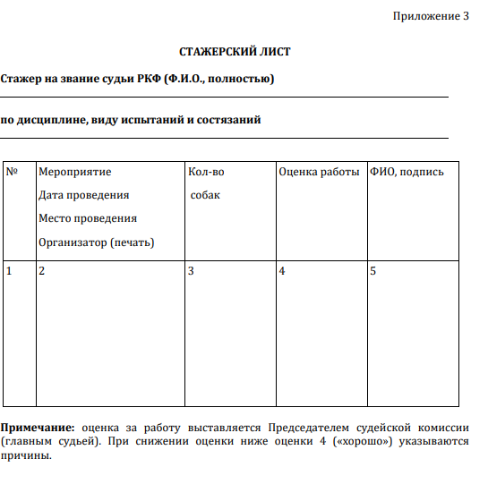 5.3.4. Стажерский лист (Приложение 3) и/или Лист учета судейской работы (Приложение 4), подтверждающий стажировки. Количество стажировок определяется в Приложениях 7.1, 7.2 и зависит от требований по конкретной Дисциплине.
