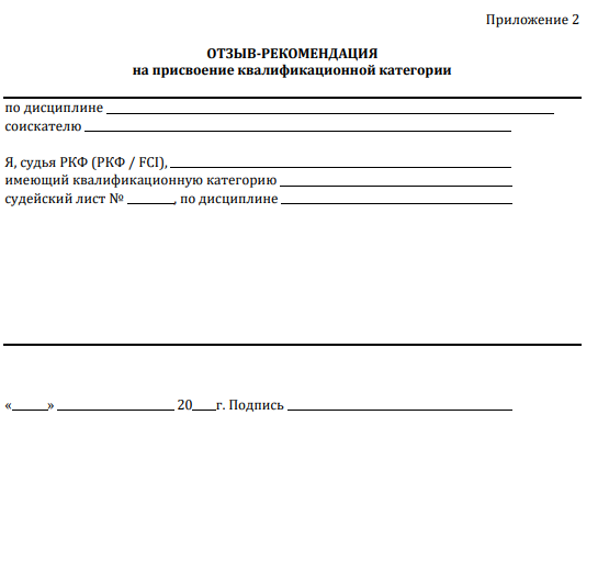 4.2.1.10. Отзывы-рекомендации от судей по Дисциплине, на которую претендует соискатель (Приложение 2). Количество представленных отзывов определяется в Приложении 7.1 и зависит от требований по конкретной Дисциплине.