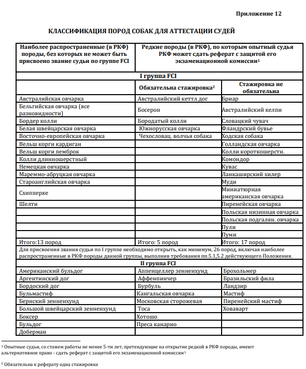 2.10. Распространенные и редкие породы – породы собак для аттестации (Классификация, Приложение 12), список которых составляет кинологический департамент РКФ, изменяя по мере необходимости. Породы в каждой из групп FCI разделены на 2 перечня пород: наиболее распространенные в системе РКФ, без которых не может быть присвоено звание судьи РКФ-FCI по группе FCI; редкие породы в системе РКФ - с обязательной предварительной одной стажировкой (см.п.2.15, Приложение 12 – сноска 2) или без нее (в зависимости от редкой породы), по которым опытный судья РКФ-FCI может сдать реферат с защитой его перед экзаменационной комиссией. Количество открытых пород из этого списка является одним из основных условий для присвоения соискателю звания судьи РКФ-FCI по группе пород.