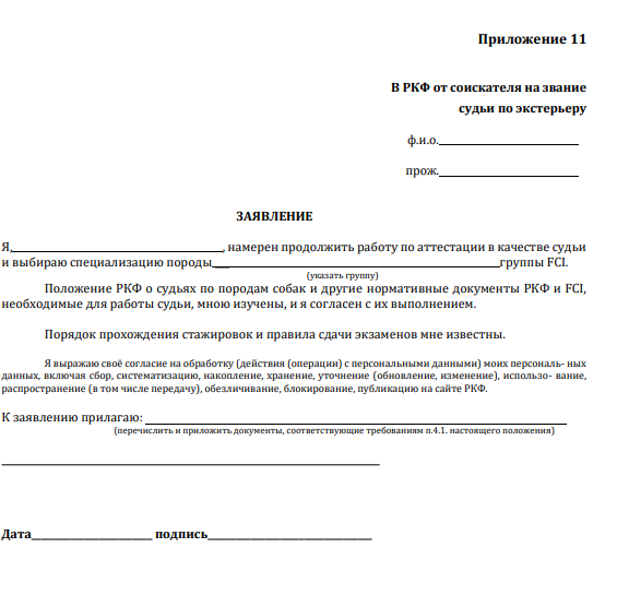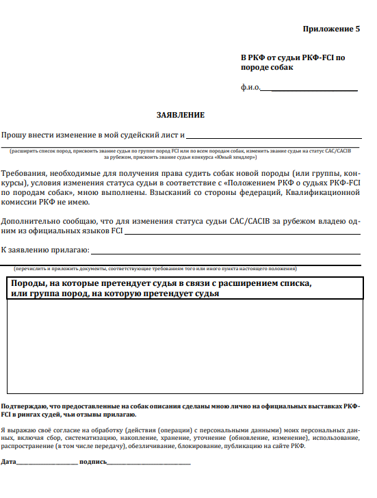 - заявление установленной формы с указанием предпочтительного иностранного языка FCI (Приложение 5) и причиной подачи заявления (расширение списка пород и/или изменение статуса судьи на CAC/CACIB за рубежом);