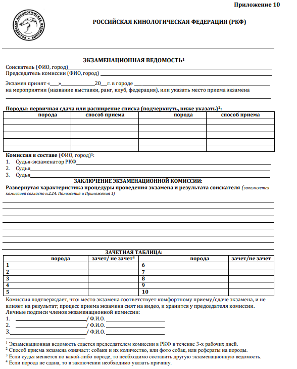 2.25. Экзаменационная ведомость – формуляр, в котором экзаменационной комиссией судей РКФ-FCI отражается комплексная оценка работы соискателя (Приложение 10).