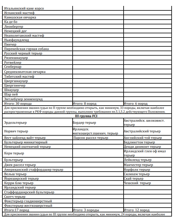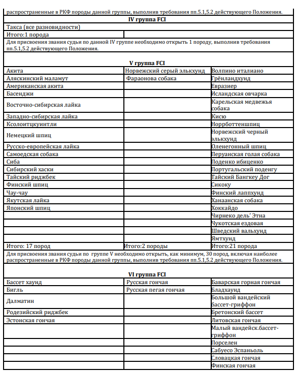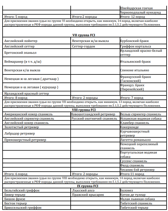 6.1. Звание «Судья РКФ-FCI по всем породам собак» может быть присвоено соискателю, открывшему все 10 групп пород FCI, и имеющему стаж практического судейства не менее 10-ти лет с момента открытия любой первой группы пород FCI.