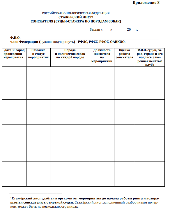 2.15. Стажерский лист – формуляр, в котором судья РКФ-FCI отмечает прохождение стажировки соискателем (Приложение 8).
