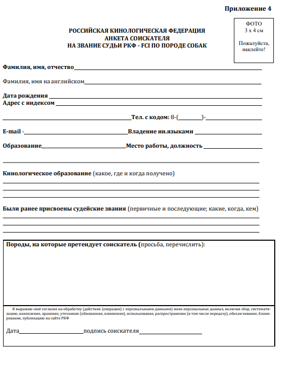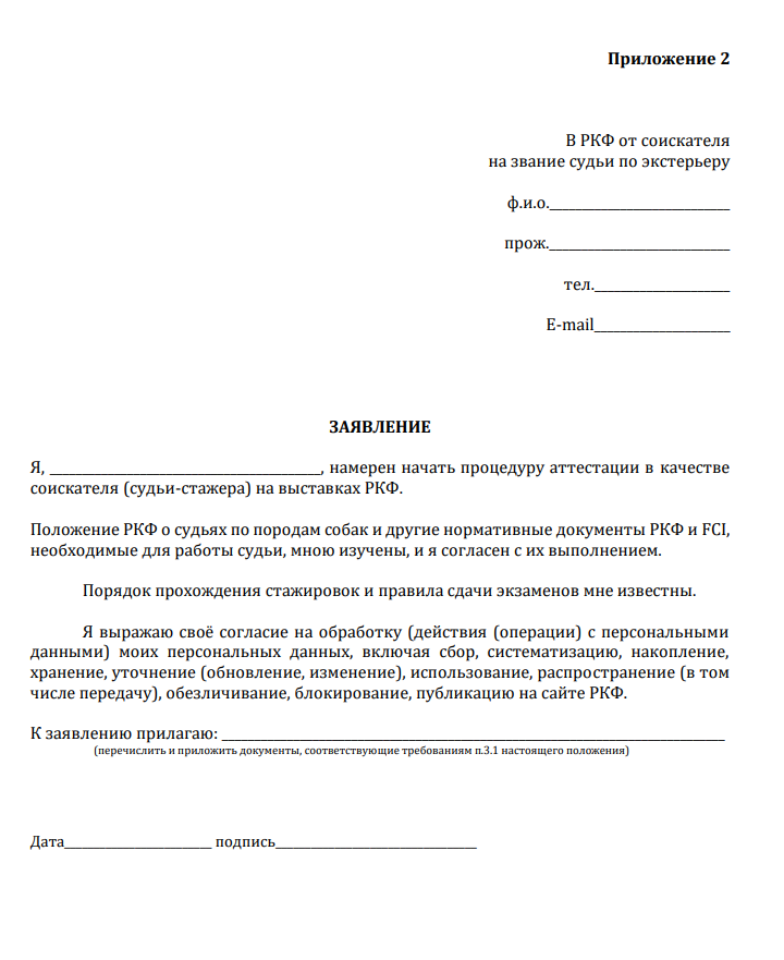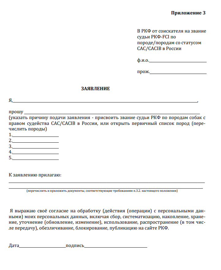 3.1. Перед предоставлением документов в соответствие с п.3.2. настоящей статьи Положения, лицо, изъявившее желание получить первичное звание судьи РКФ-FCI по породе, подает в РКФ заявление установленной формы (Приложение 2) о своем намерении начать процедуру аттестации в качестве соискателя, с приложением копии документа об окончании курсов. Такой соискатель, в случае нарушения им Положения может подвергнуться взысканию, вплоть до отказа КК РКФ в приеме документов, перечисленных в п.3.2. настоящей статьи Положения. Сведения о соискателе с момента подачи им заявления вносятся в реестр учета соискателей КК РКФ; таким образом, соискатель должен вести себя как будущий судья РКФ-FCI.