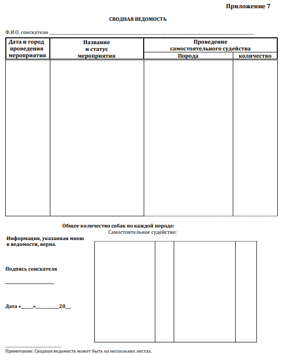 - сводная ведомость (Приложение 7) с отметками о выставках с момента открытия любой первой группы FCI (не менее 30-ти выставок по выбору соискателя, без учета племенных смотров).