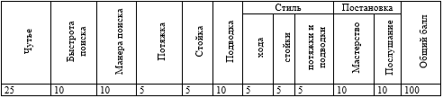 13. На испытаниях работа собак легавых пород расценивается по следующей шкале максимальных баллов (табл.1):