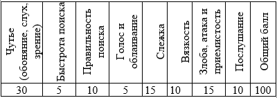 3. На испытаниях выявляются и расцениваются следующие качества: чутье (обоняние, слух, зрение), быстрота поиска, правильность поиска, голос, характер облаивания, слежка, злобность к зверьку и приемистость, послушание.