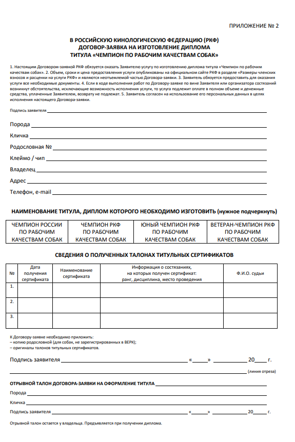 2.3.2. В случае если собака участвовала в сертификатных состязаниях и ей был присвоен сертификат, организаторы должны выдать владельцу / ведущему талон титульного сертификата, заверенный оригинальной подписью главного судьи и оригинальной печатью организации. Отчетный талон титульного сертификата (отрывной корешок талона) прикрепляется к рапортичке.