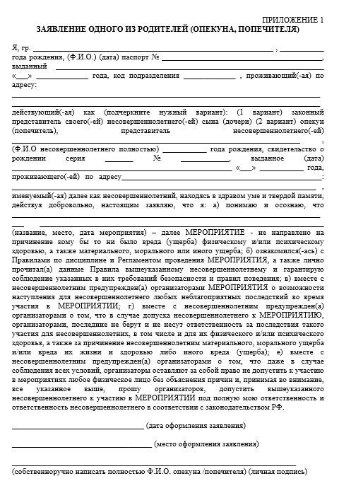 2.1.2.3. Участие в мероприятиях физических лиц, не достигших на момент проведения мероприятия совершеннолетия (18 лет) регулируется п.3.3. положения «О проведении испытаний и состязаний собак (кроме испытаний и состязаний охотничьих собак)». Заявление одного из родителей (опекуна, попечителя) несовершеннолетнего участника приведено в Приложении 1.