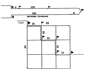 Примерная разметка дистанции буксировки и участка для проверки изменения направления движения собаки по команде проводника.