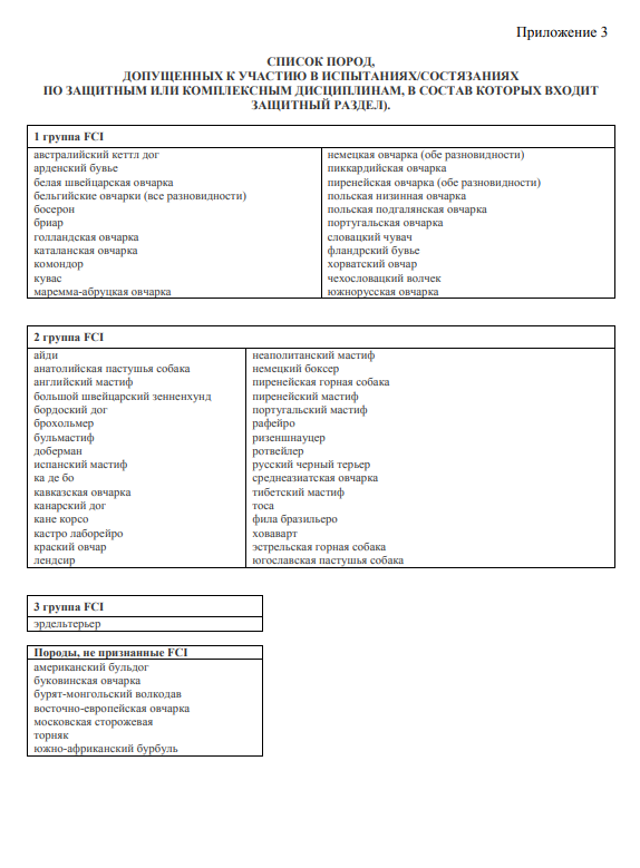 К участию в состязаниях допускаются собаки только тех пород, которые перечислены в списке Приложения 3.
