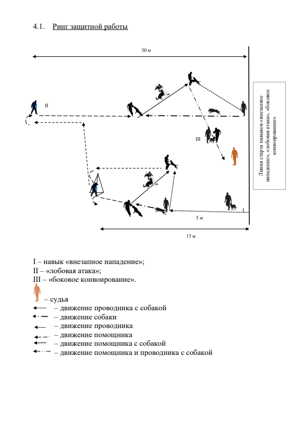 5.3.5.2. Команды: допускается семь команд без начисления штрафа: фиксирующая; на сопровождение проводника; команда помощнику на начало движения; на конвоирование, команда помощнику на остановку; фиксирующая команда; команда собаке на сопровождение проводника.