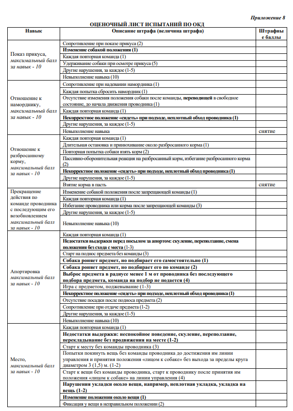 6.1.1. Из максимально возможной суммы баллов за каждое упражнение судья вычитает штрафные баллы, полученные собакой по результатам выполнения навыка.