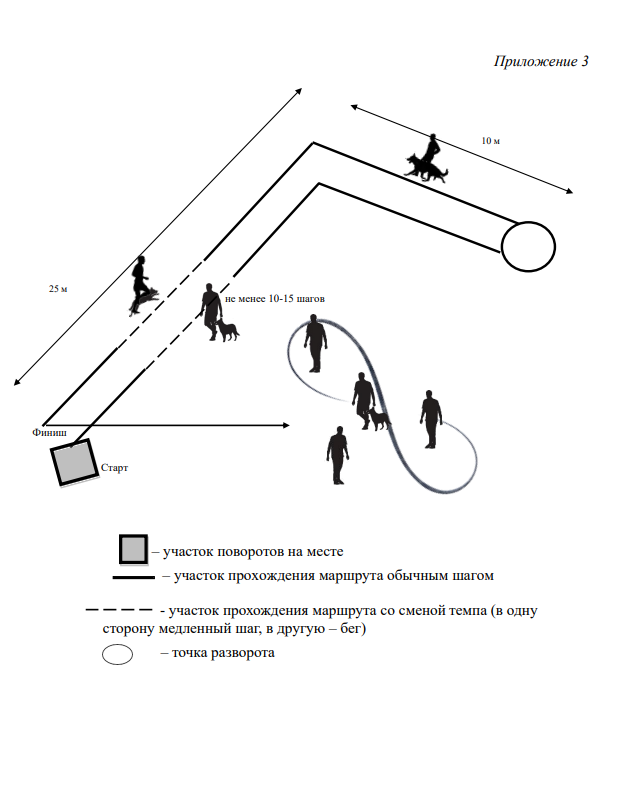 5.2.1.5. Если собака уходит с площадки, проводник должен подозвать собаку, допускается подача еще двух повторных команд. Если собака не возвращается после третьей команды, она снимается с испытаний.