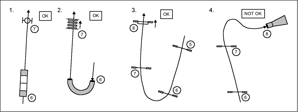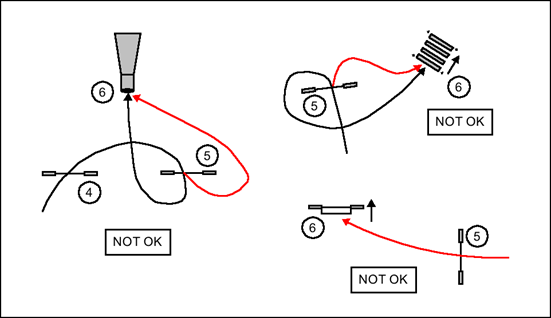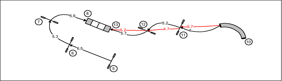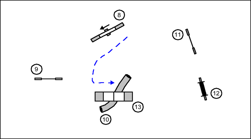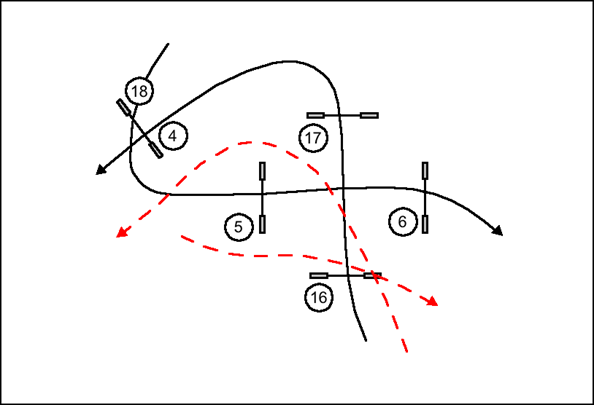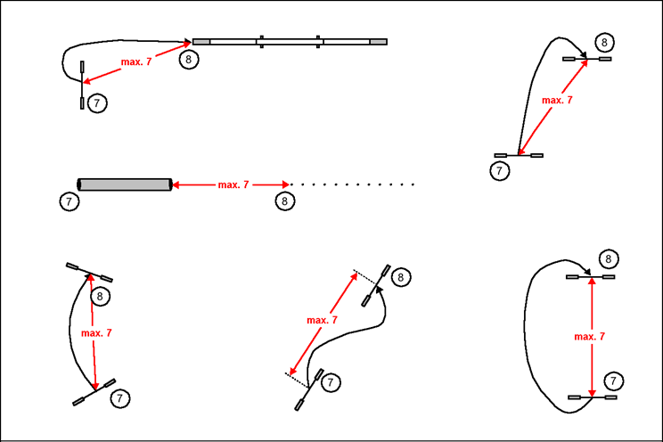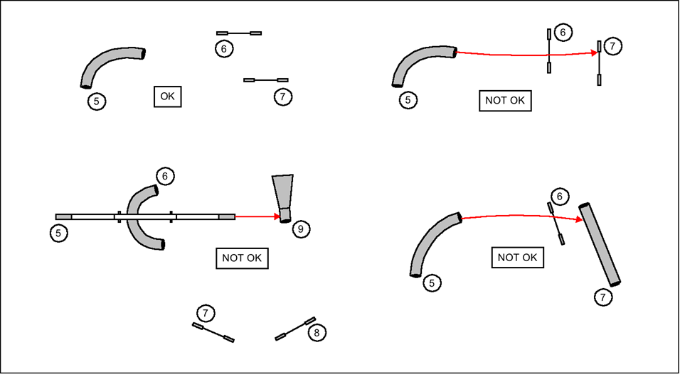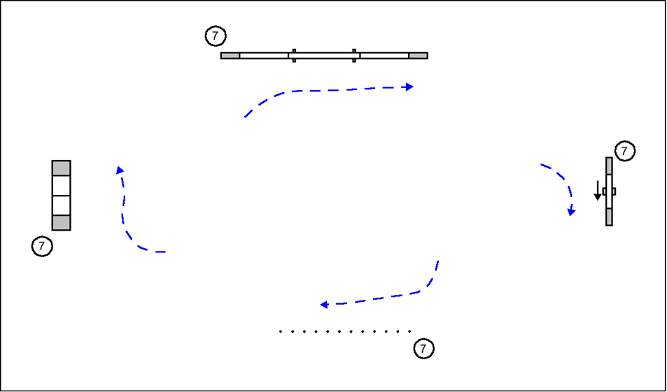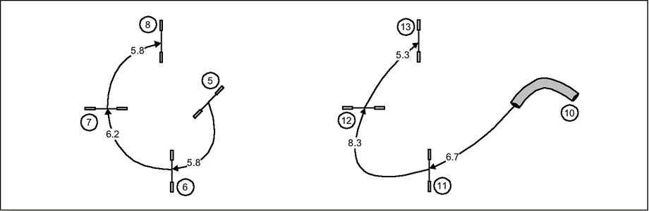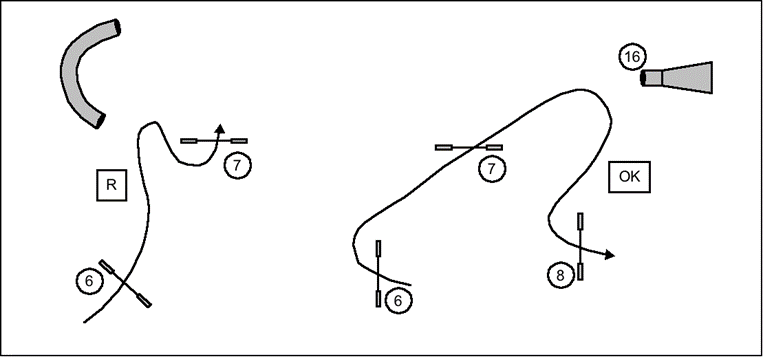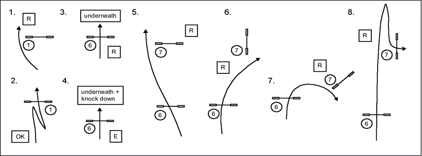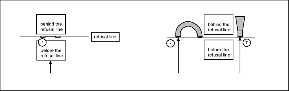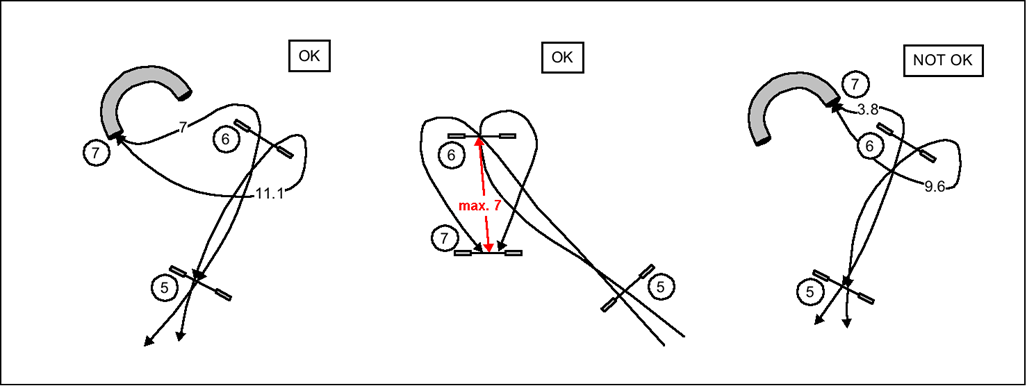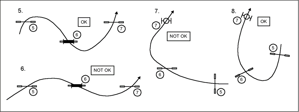Справа собака приземляется до линии отказа следующего препятствия (№8) и пересекает эту линию в том месте, откуда она не может однозначно стартовать на правильное препятствие – «без штрафа».