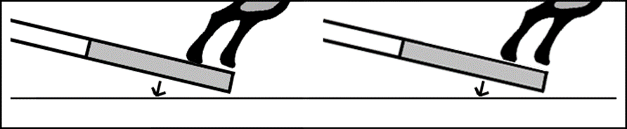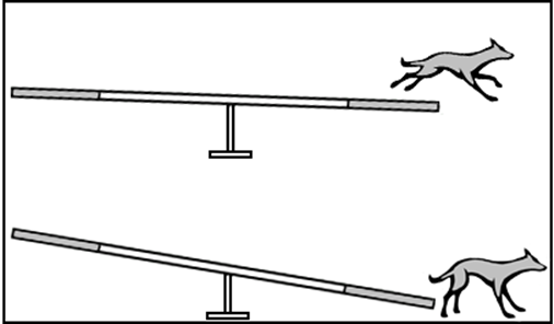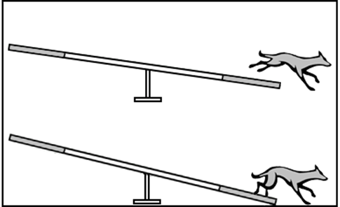 б) данная ситуация более трудна для судьи. Собака толкает качели к земле, передние лапы уже в воздухе, но судья не может быть уверен, что качели коснутся земли до того, как последняя лапа потеряет соприкосновение с поверхностью препятствия. В этом случае все сомнения трактуются в пользу собаки.