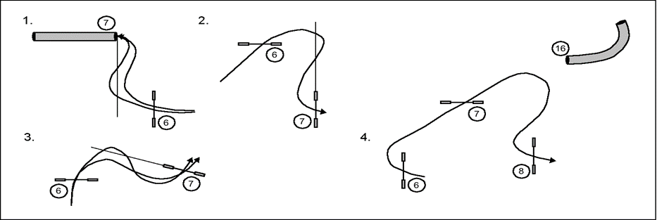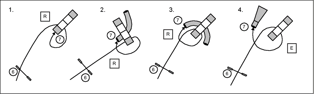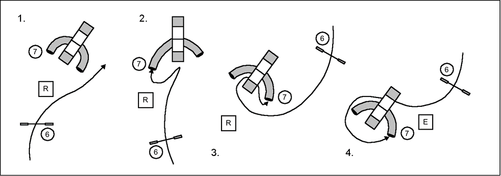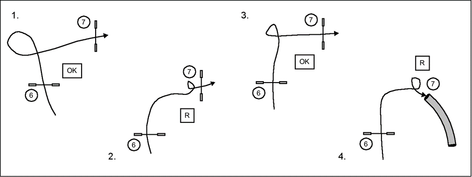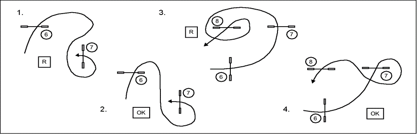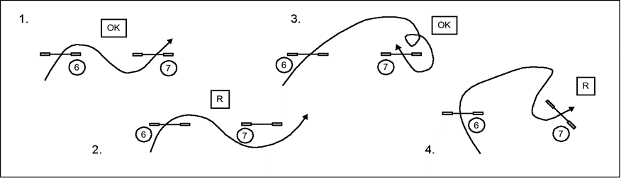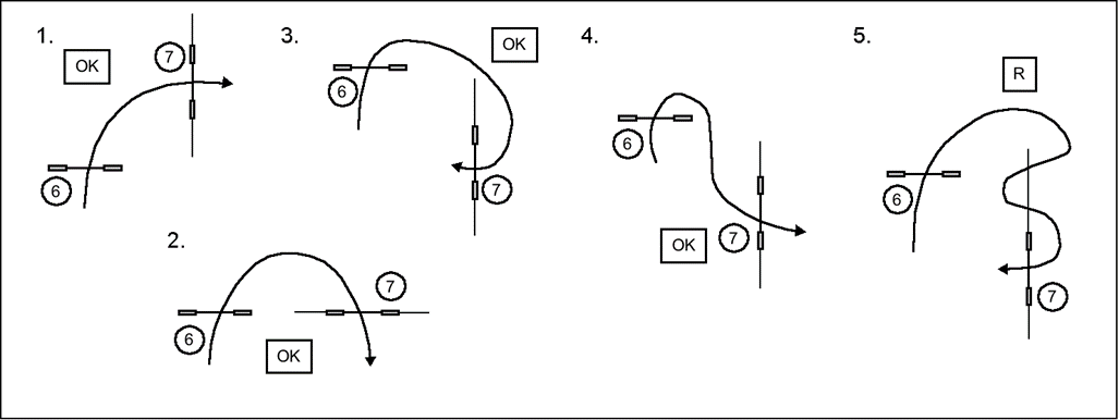 Две ситуации, приведенные на рисунке 29, противоположны и ясны для судейства. Все промежуточные ситуации, имеющие траектории движения, сходные с указанными на рисунке 29, должны оцениваться на усмотрение судьи.