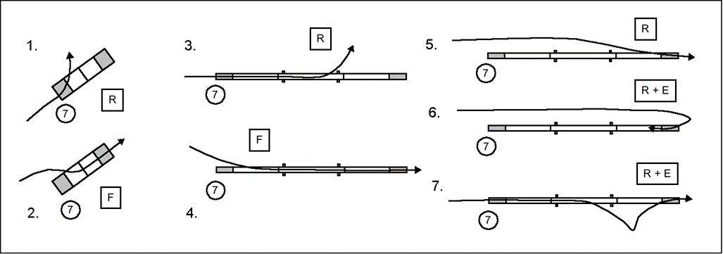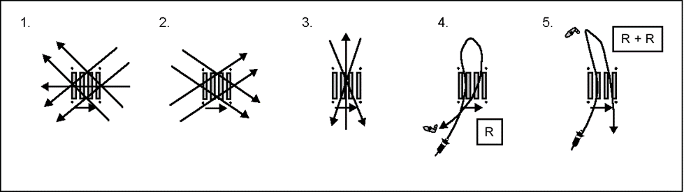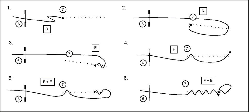5) и 6) собака пропускает створ, потом преодолевает препятствие в обратную сторону – «ошибка + снятие».